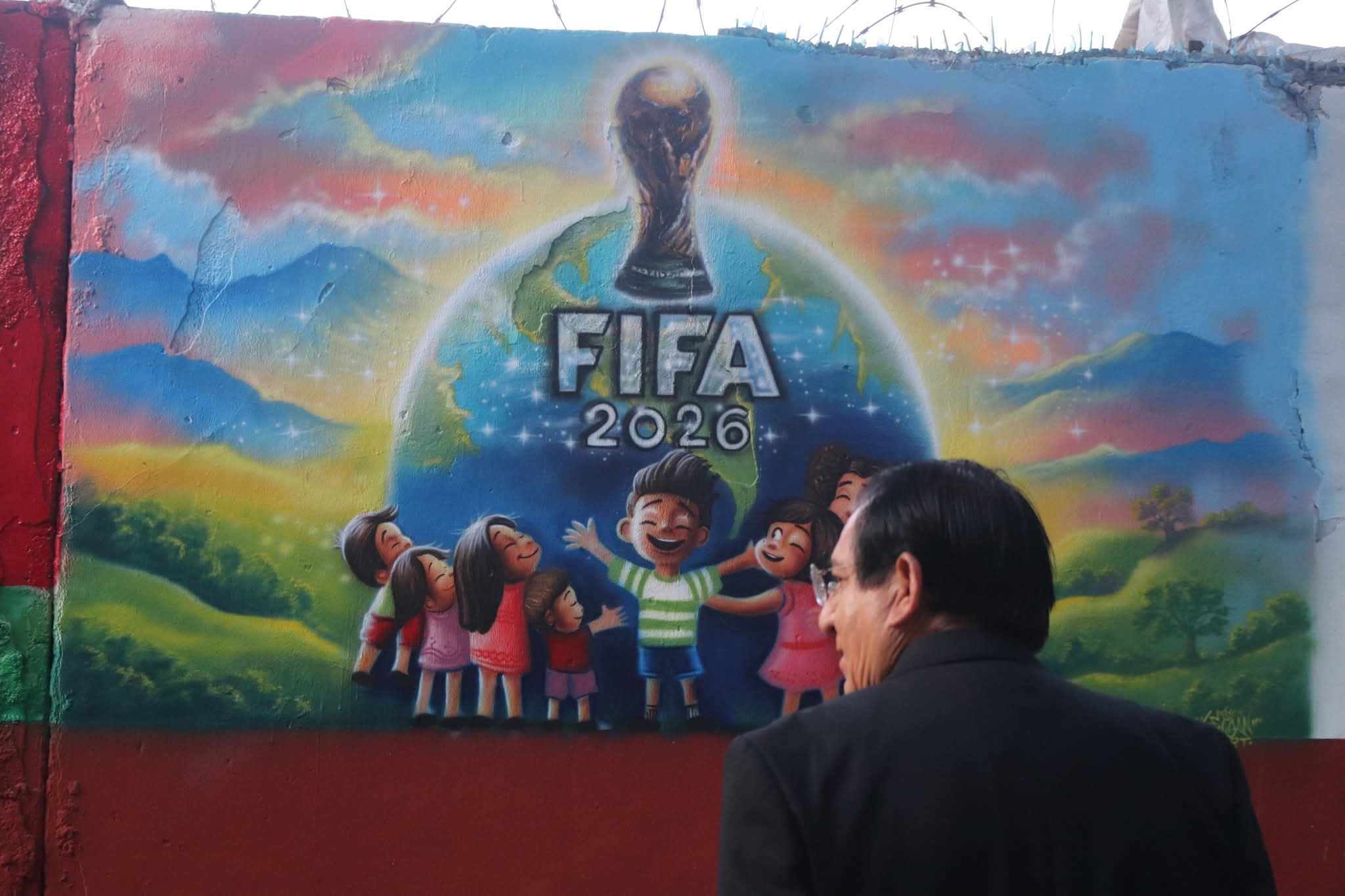 y Benedicto Marcial Romero como “veneno” elaboraron este mural en el parque de la colonia Arboledas de San Rafael, en dos días. Este mural pertenece al programa “Color esperanza” dentro de la jornada de los “Tequios por la tierra y murales mundialistas”, que muestran trazos enfocados en el mundial social.