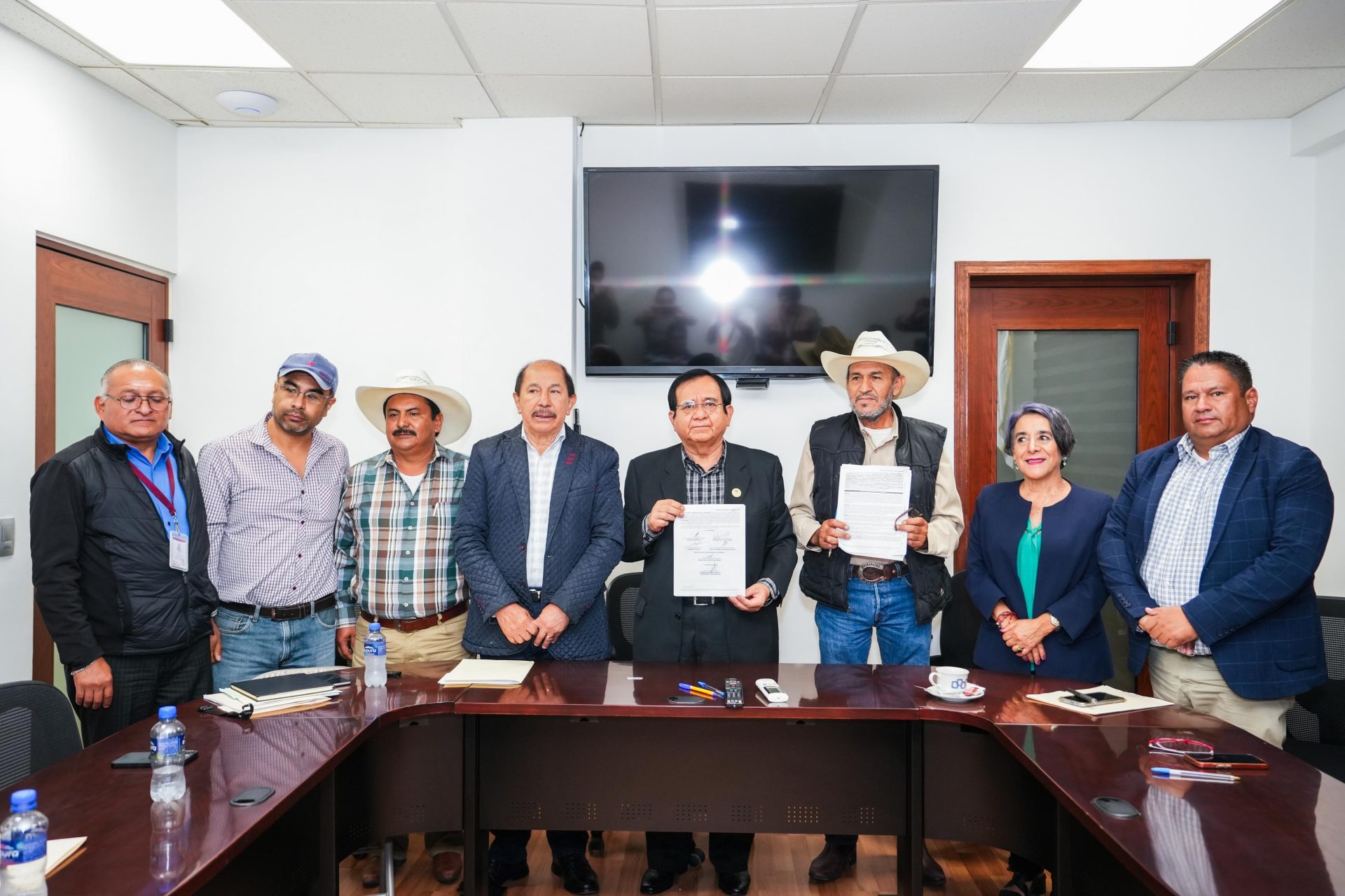 El presidente municipal, Juan Miguel Ramírez, acompañado por el director de Desarrollo Social, Valentín Sánchez, firmaron este convenio con los productores del Módulo Margen Derecha del Distrito de Riego 085 “La Begoña”, representados por el presidente del Consejo Directivo, Isidro García Escobedo.