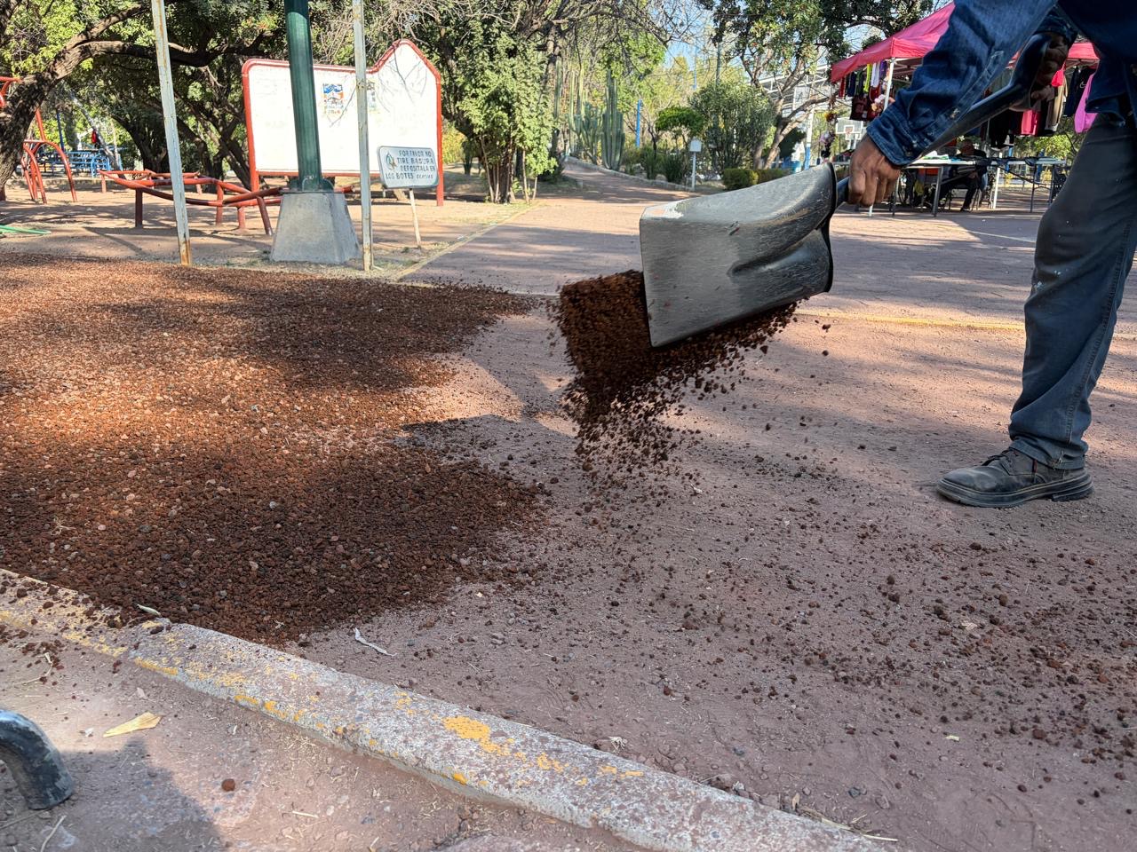 Celaya, Gto a 16 de Febrero de 2026.- Dieron inicio los trabajos de rehabilitación de la pista de trote en la Primera Sección del Parque Xochipilli, con la aplicación de tezontle a lo largo de los 1.6 kilómetros de longitud de su circuito.