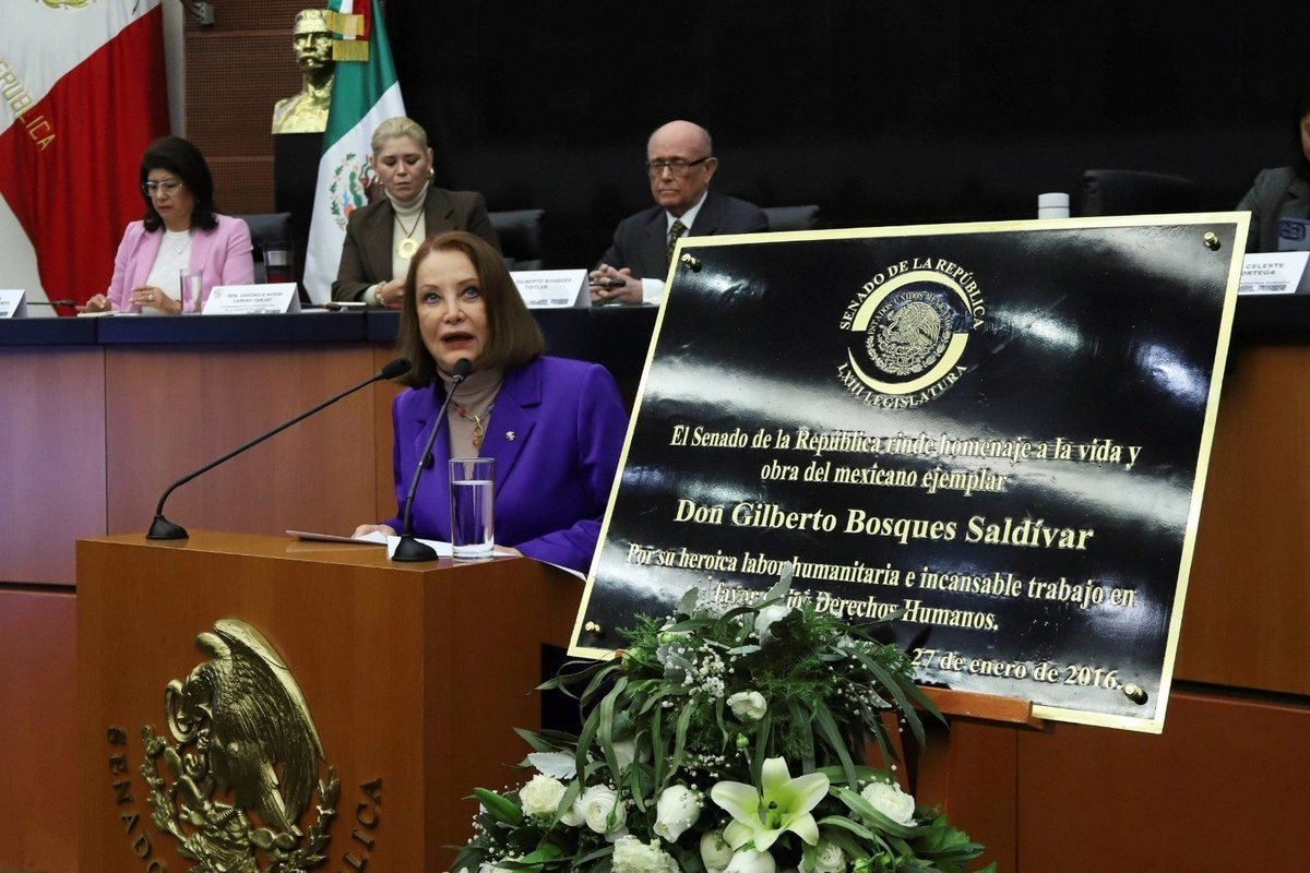 En la ceremonia, la presidenta del Senado, Laura Itzel Castillo Juárez, resaltó que el ejemplo de Gilberto Bosques “nos recuerda que en los momentos más oscuros, es posible elegir la solidaridad, la valentía y sobre todo, el jugarse la vida propia para defender la de otros.