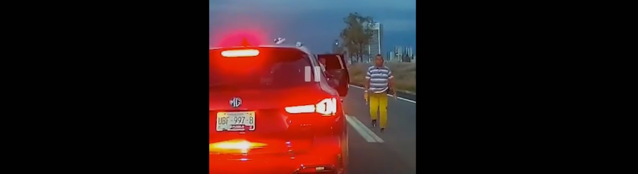 Según el video difundido en redes sociales, y que rápidamente se volvió viral, uno de los agresores pateó varias veces la puerta del conductor de la camioneta afectada reclamándole supuestamente por haberle cerrado el paso en un carril de dirección hacia la capital del estado.
