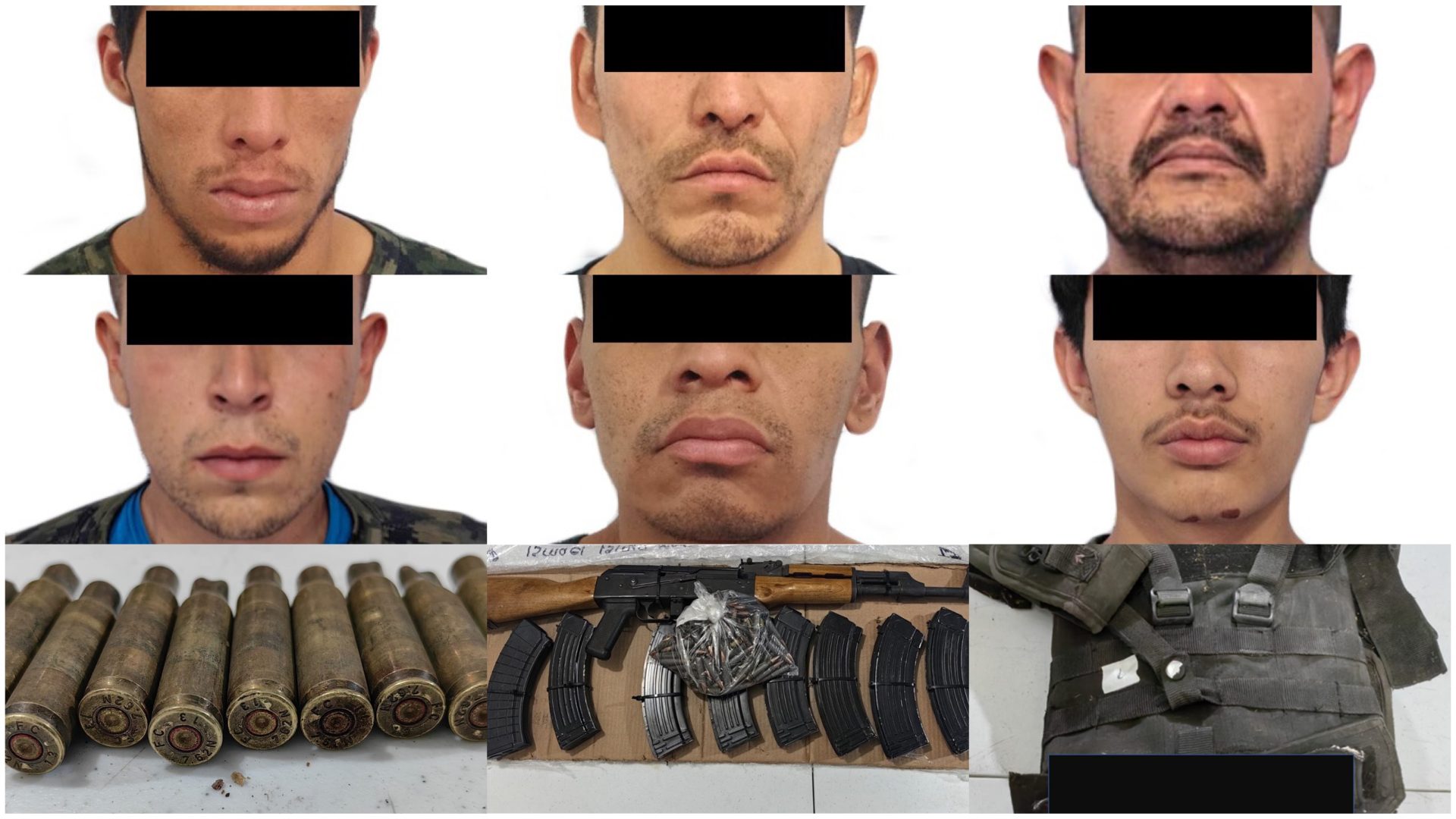 Por lo anterior, los elementos les marcaron el alto, los tripulantes intentaron huir, lo que derivó en una persecución en la que uno de los ocupantes disparó en contra de los vehículos oficiales, por lo que se repelió la agresión y lograron la detención de Juan “H”, Heriberto “M”, René “T”, Pedro “R”, José “M” y Brayan “L”. Durante el operativo, la autoridad aseguró 14 armas largas, mil 603 cartuchos, 81 cargadores, equipo táctico y tres vehículos.