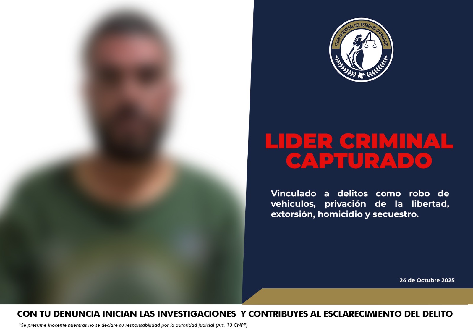 GUANAJUATO, GTO., A 24 DE OCTUBRE DE 2025.- “El Zorro” permanecerá en prisión; líder criminal de la región Laja-Bajío es detenido en Villagrán