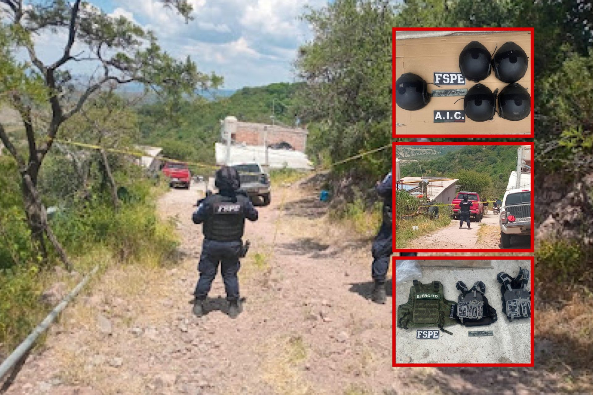 En el lugar se aseguraron tres vehículos tipo pick up —uno con reporte de robo vigente en Apaseo el Alto, otro con placas de Texas y un Toyota Tacoma—, así como dos motocicletas (Honda e Italika, esta última sin placas). También se localizaron un arma de fuego larga, un fusil, un cargador, ocho chalecos tácticos, cinco cascos tácticos, tres chalecos balísticos, tres cascos balísticos, una bolsa con artefactos ponchallantas y una gorra.