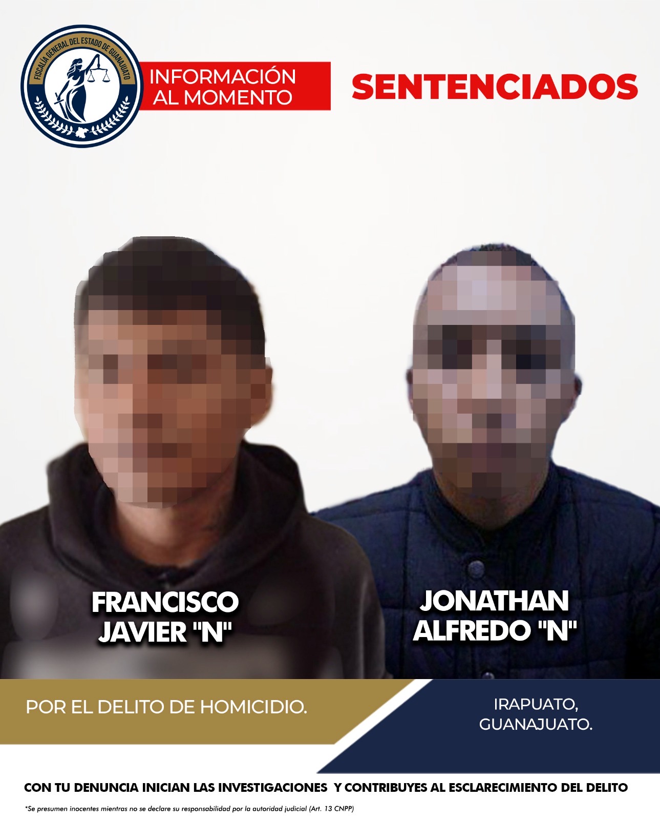 GUANAJUATO, GTO., A 28 DE AGOSTO DE 2025.- En audiencia de procedimiento abreviado, la Fiscalía General del Estado de Guanajuato logró sentencia condenatoria de cárcel en contra de FRANCISCO JAVIER “N”, alias “el panchillo”, y JONATHAN ALFREDO “N”, alias “el payaso”, por su responsabilidad penal en el delito de homicidio cometido en el municipio de Irapuato.