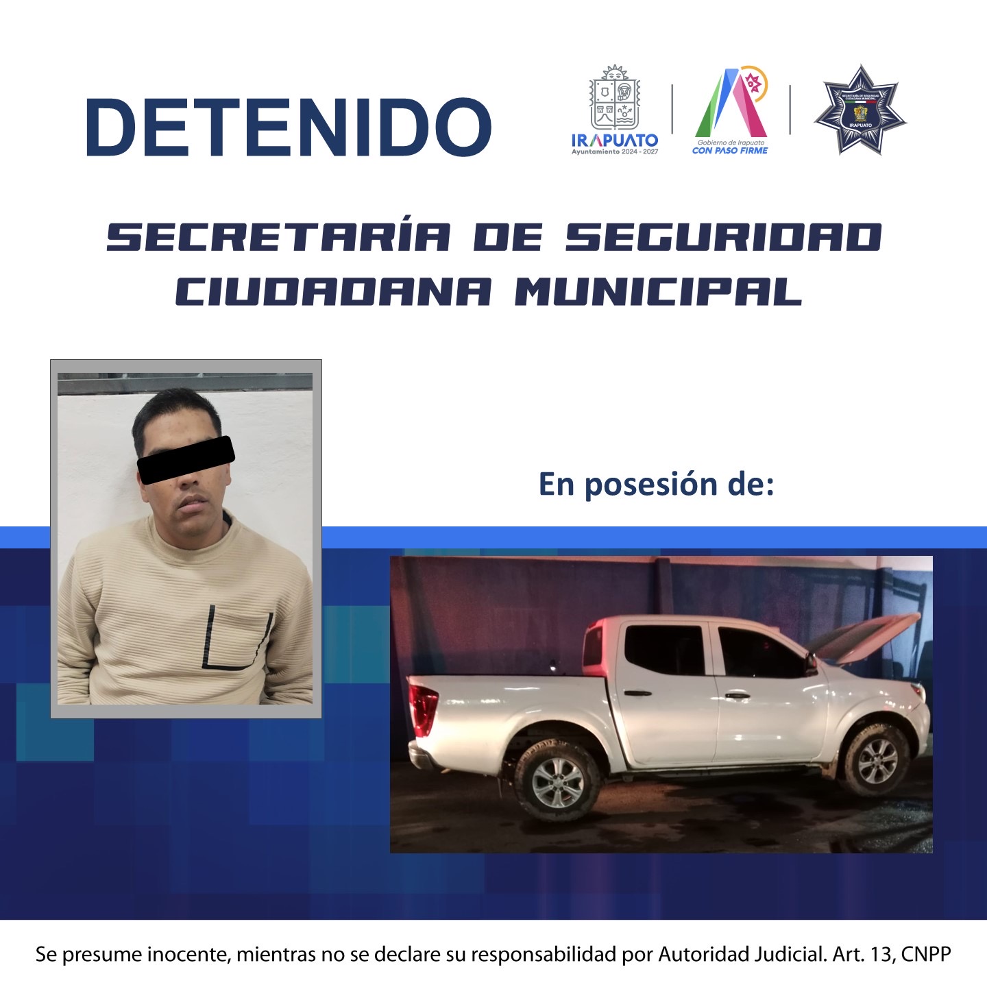 Irapuato, Gto., a 16 de octubre de 2025.- En atención a un alertamiento emitido por el sistema de arcos carreteros y videovigilancia del C4, integrantes de la Policía Municipal de Irapuato aseguraron una camioneta que presentaba irregularidades en sus registros, además de realizar la detención de un individuo con antecedentes penales.