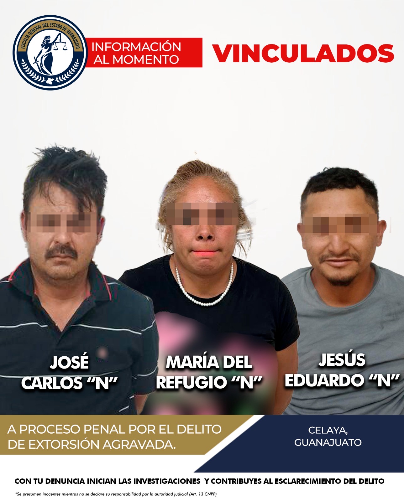 GUANAJUATO, GTO., A 18 DE ABRIL DE 2025.- La Fiscalía General del Estado de Guanajuato, a través de una investigación a cargo de la Fiscalía Especializada en Investigación de Delitos de Alto Impacto, detuvo a José Carlos “N”, María del Refugio “N” y Jesús Eduardo “N”, por el delito de extorsión en el municipio de Celaya.