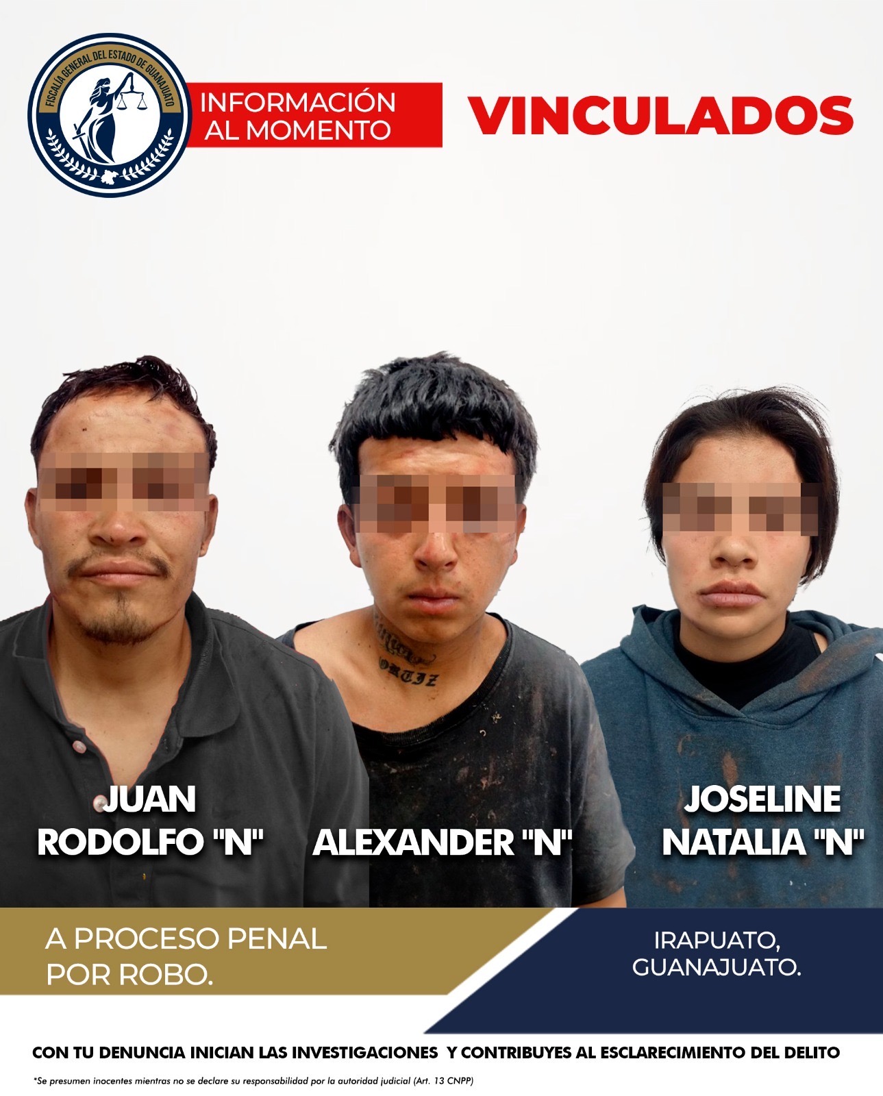 GUANAJUATO GTO., A 06 DE ABRIL DE 2025.- ALEXANDER “N”, JUAN RODOLFO “N” y JOSELINE “N”, han sido vinculados a proceso