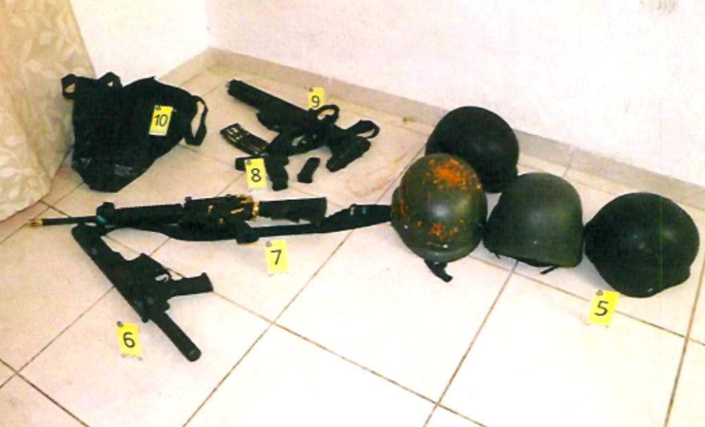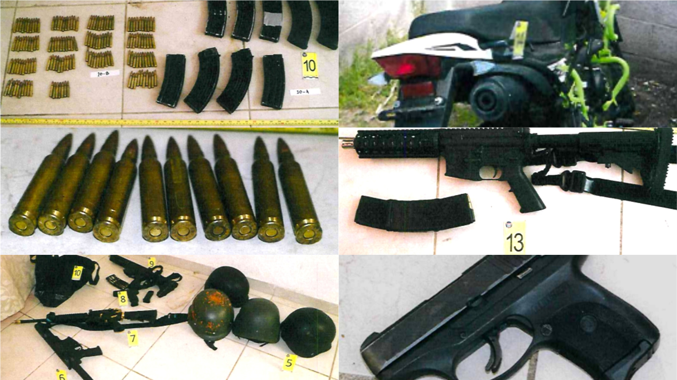 En el lugar, los agentes de investigación aseguraron cuatro armas de fuego tipo fusil y dos cortas, 14 cargadores, 233 cartuchos útiles, tres chalecos balísticos, cuatro cascos tácticos, dos teléfonos, dos contenedores con 10 litros de combustible, un inmueble, un vehículo blindado, una motocicleta y 10 cartulinas con mensajes alusivos a un grupo delictivo.