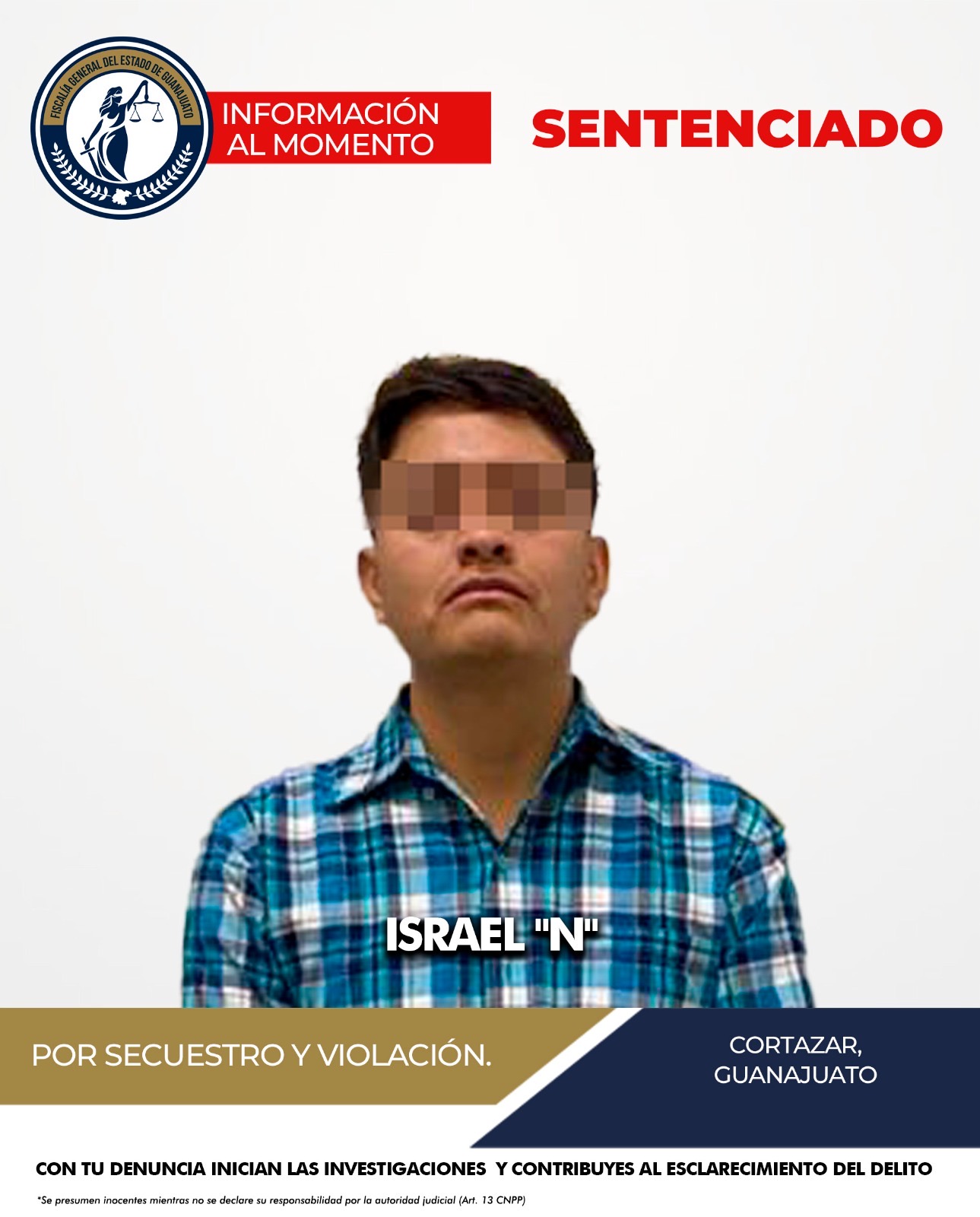 GUANAJUATO, GTO., A 23 DE ABRIL DE 2025.- La Fiscalía General del Estado de Guanajuato logró una sentencia ejemplar en contra de ISRAEL “N”, culpable de los delitos de secuestro agravado y violación calificada, en hechos ocurridos el 1 de enero de 2023 en el municipio de Cortazar.