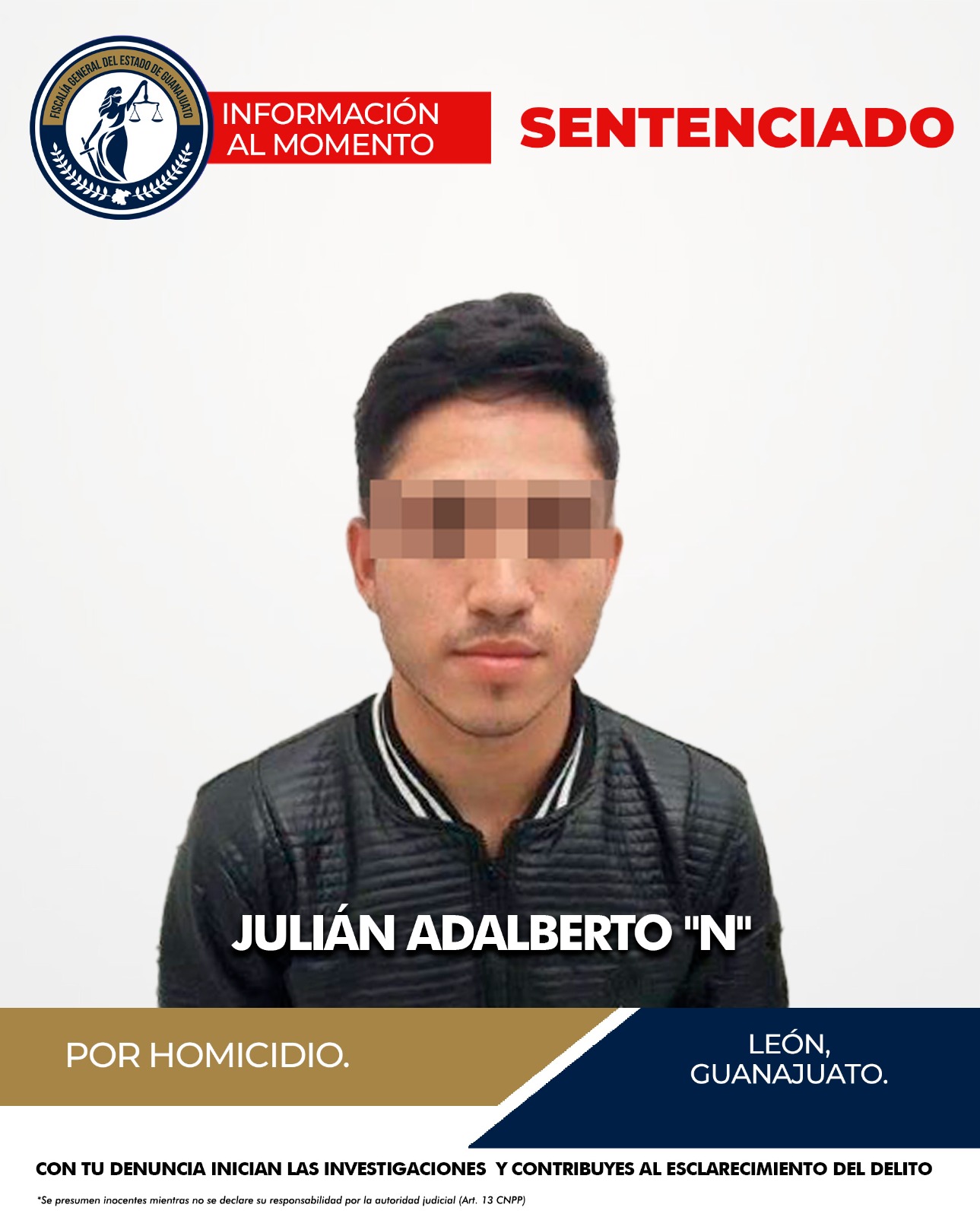 GUANAJUATO GTO., A 07 DE ABRIL DE 2025.- Por el homicidio de un menor de edad en León JULIÁN ADALBERTO “N”, alias “El Colima”, pasará 32 años en la cárcel, luego de que la Fiscalía General del Estado de Guanajuato demostró su responsabilidad en el asesinato de un menor de edad, ocurrido el 30 de diciembre de 2022, en la ciudad de León.